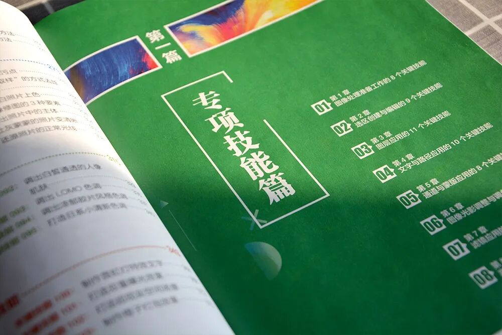 第1篇(第1-8章):专项技能篇。主要从图像处理准备工作、选区创建与编辑、图层应用、文字与路径应用、通道与蒙版的应用、图像光影调整与调色、滤镜应用以及高效处理图像的方法8个方面深入讲解Photoshop的专项操作技能与技巧,帮助读者透彻掌握每一项关键技能,迅速提高图像处理能力。