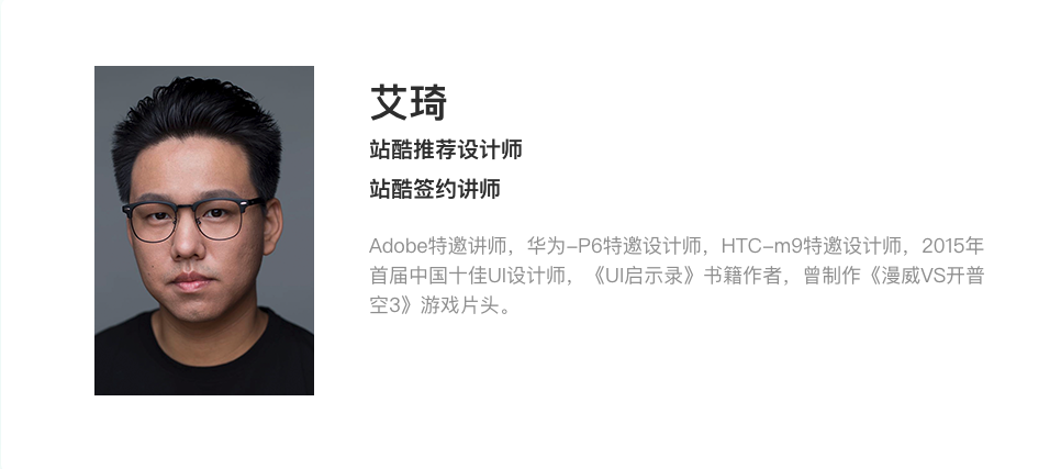 PS课程主讲老师是艾琦(站酷ID:aiki007),站酷推荐设计师,Adobe特邀讲师,拥有多年授课经验,熟悉小白同学会遇到的各种常见问题,讲解风格清晰到位。