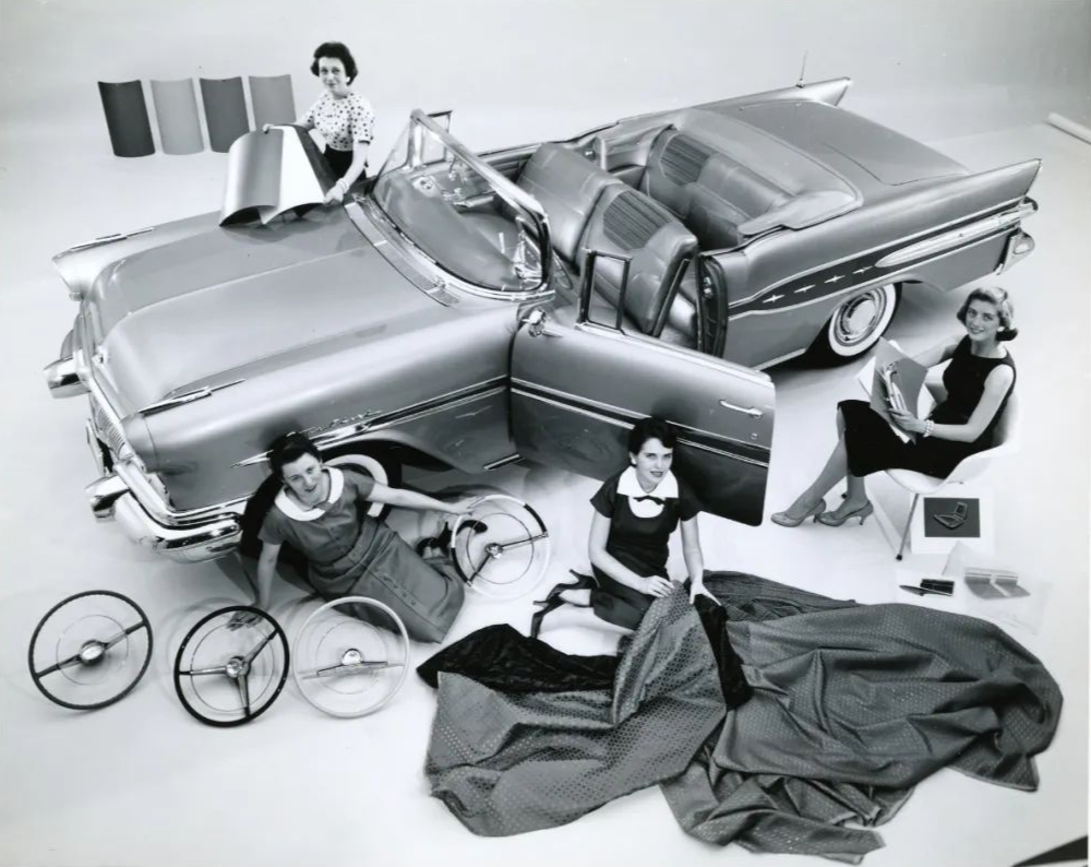 除了展览和产品设计,如为北极牌电器设计外观,“设计小姐”在底特律的工作主要是对汽车内部进行设计。从车门到座位装饰细部、配件、颜色和面料(随时要注意避免各种潜在的隐患,比如,哪里可能会勾住女人的尼龙丝袜),一切都要设计,涉及的品牌包括雪佛兰、别克、凯迪拉克、奥尔兹莫比尔和旁蒂克。虽然这些都很重要,不过对以设计外部车身为重头戏的领域来说,这些都是很枯燥的活计。团队还有一些更有野心也更持久的创意,包括早期的车载电话系统、巧妙隐蔽的器材箱、可伸缩安全带和可通过仪表板控制的儿童安全锁扣等。随着郊区范围的不断扩张,日常通勤(和家庭对中等汽车的需求)成为设计需要解决的重要问题。通过设计小姐团队的这些创新,汽车逐渐变得更像家居空间,几乎如同家中的客厅,具备了现代家庭所需的便捷设备。