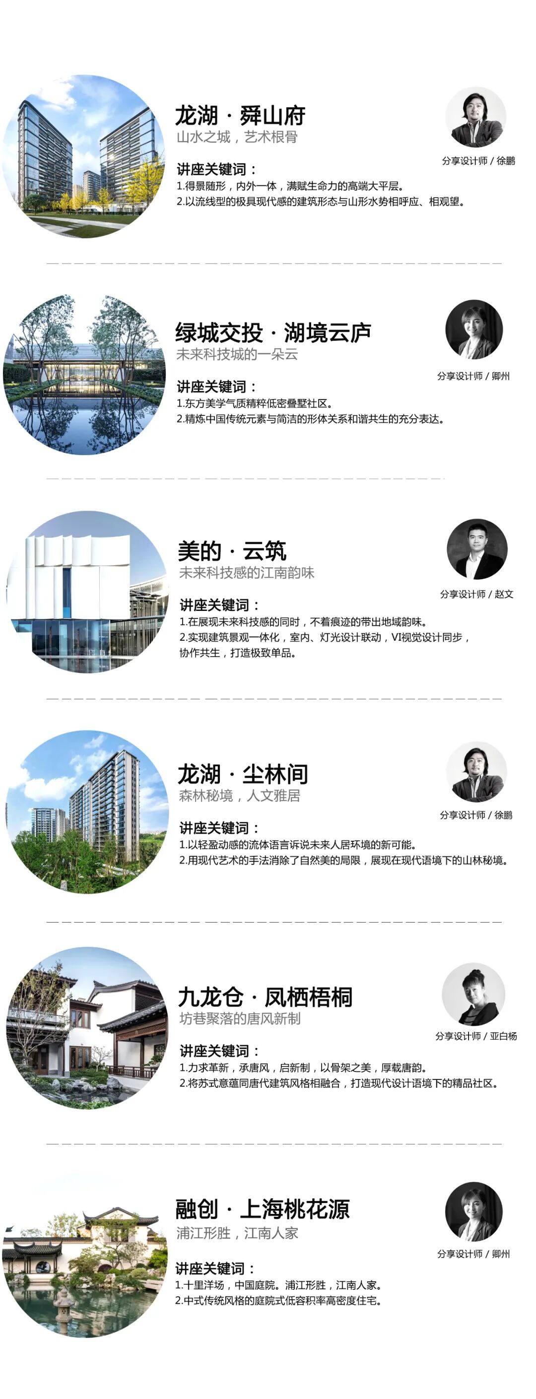 景观课程中的6个项目是从新微游学百余场的线下楼盘考察中优选而来,是综合现场参观学员的口碑反馈和网络后台数据所甄选出来的代表性项目。项目均是一线地产的精品项目,也是知名景观设计公司的得意之作。分享讲师是项目的设计总监或主创,资深的从业经验和对项目的一手把控,将深度解读该项目从设计源头到落地营造的经验与心得。