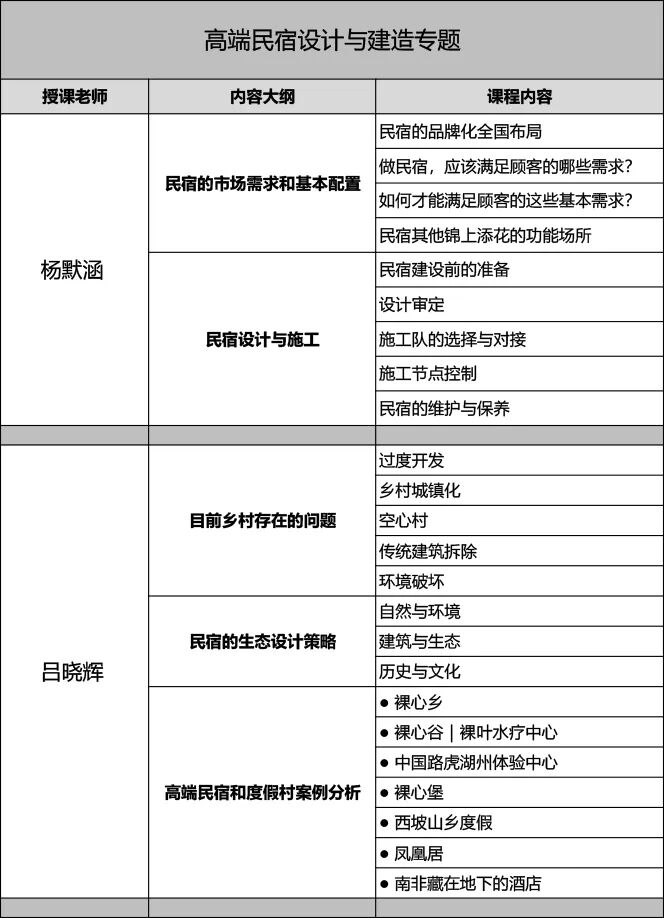 民宿课程邀请了三位在民宿行业权威的设计师做讲师,以国内知名民宿品牌为例,从实际出发,解读高端民宿设计与建造的方法以及最前瞻的民宿设计理念和趋势。