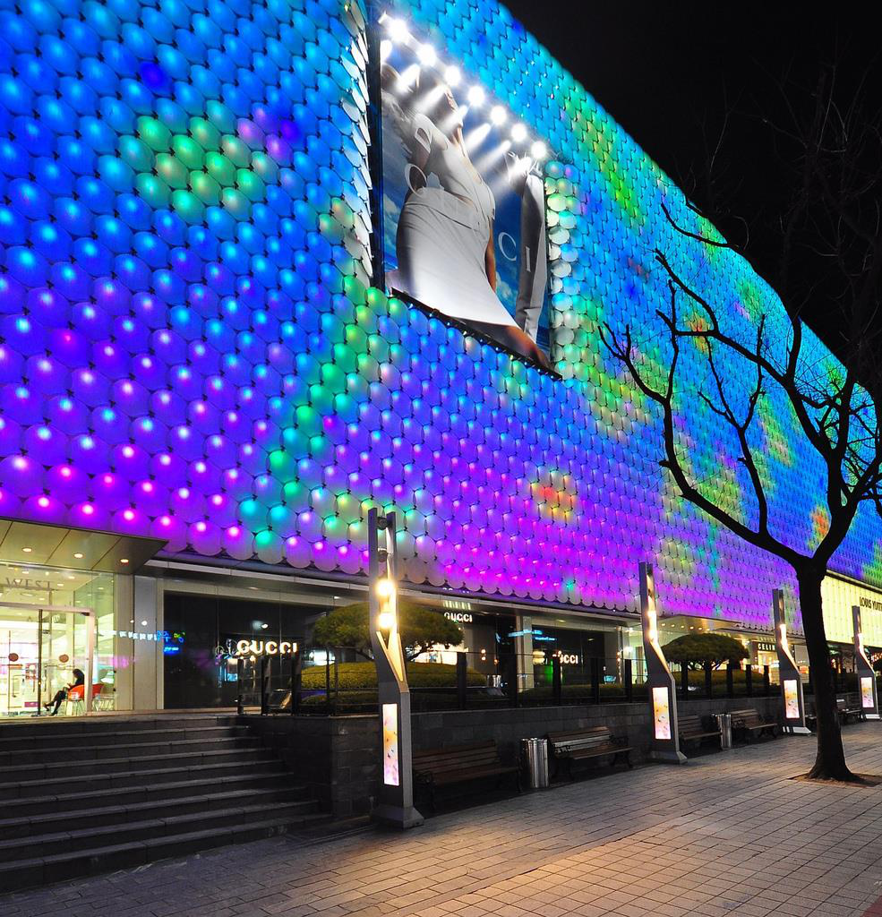 位于多伦多市的一个商业项目配套建筑艺术装置,正是应用了这项特殊涂层技术:这些材料将金属光泽涂层与有机树脂材料表面相结合,作为局部模块化的发光单元表皮,构成了富有生动变化的装饰效果。