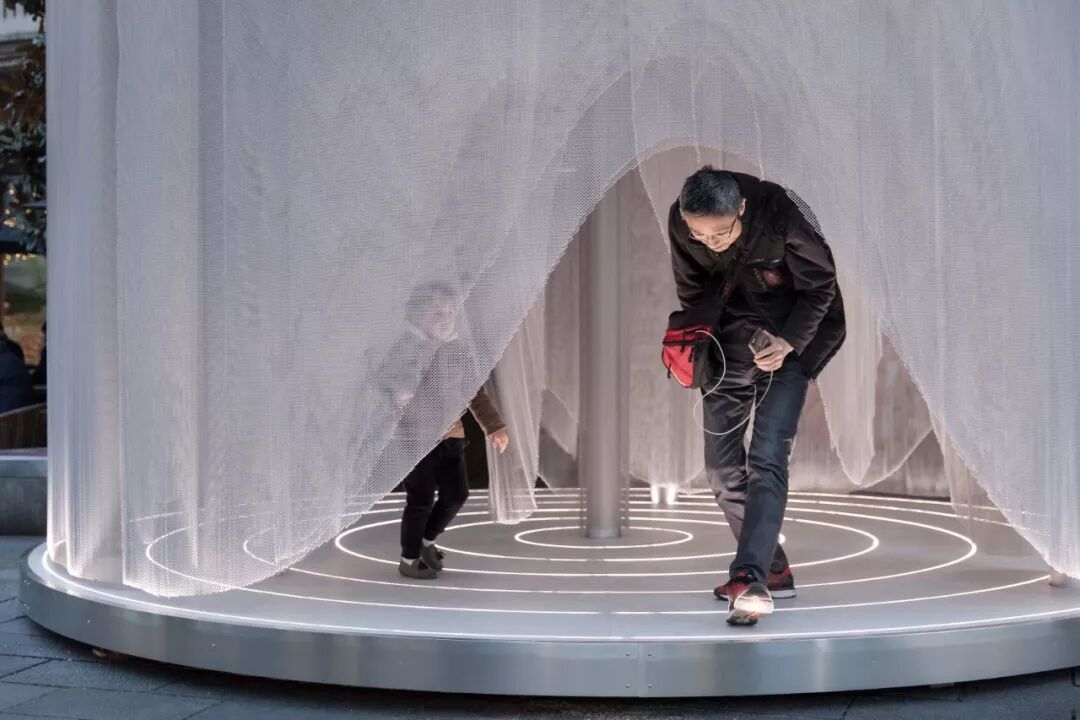 装置高度四米,金属幕帘或围合或遮挡,表面有光泽和垂感,光会投射形成灰空间,亦可以透射光影。叠影和人的互动关系,有实有虚,这种剖面的关系和平面意义上迷宫的意义也是相通的。当你在这个城市探索,有时会走到死胡同,有时会柳暗花明又一村。