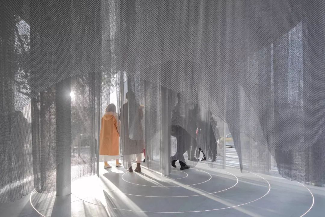 利用现代的半透明的金属幕帘这样一种绿色环保材料形成内外空间的在视觉上和空间上内敛而优雅的过渡,半透明材料所呈现的若隐若现的视觉模糊传递着层次丰富的空间纵深感。