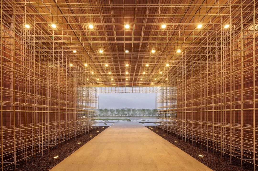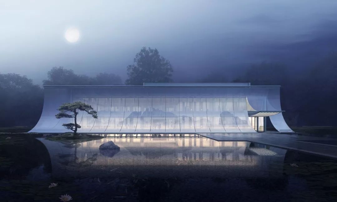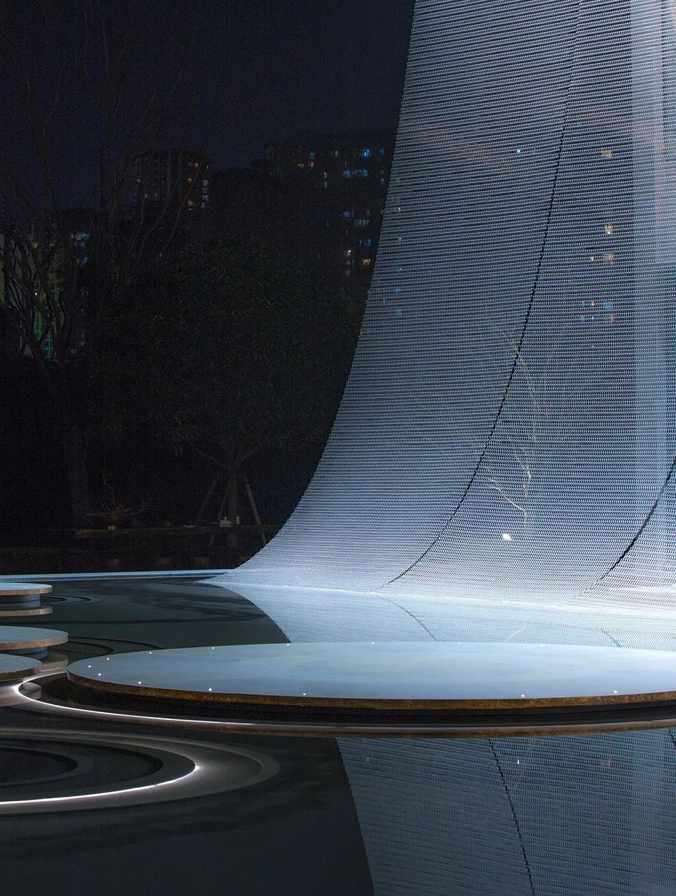 金属幕帘自然下垂所形成的符合自然力学逻辑的优美的弧线向同样符合自然结构逻辑的中式建筑致敬,同时通过把现代钢结构的逻辑之美通过外露的形式表现出来,与景观结合在一起形成朦胧而富于诗意的空间。