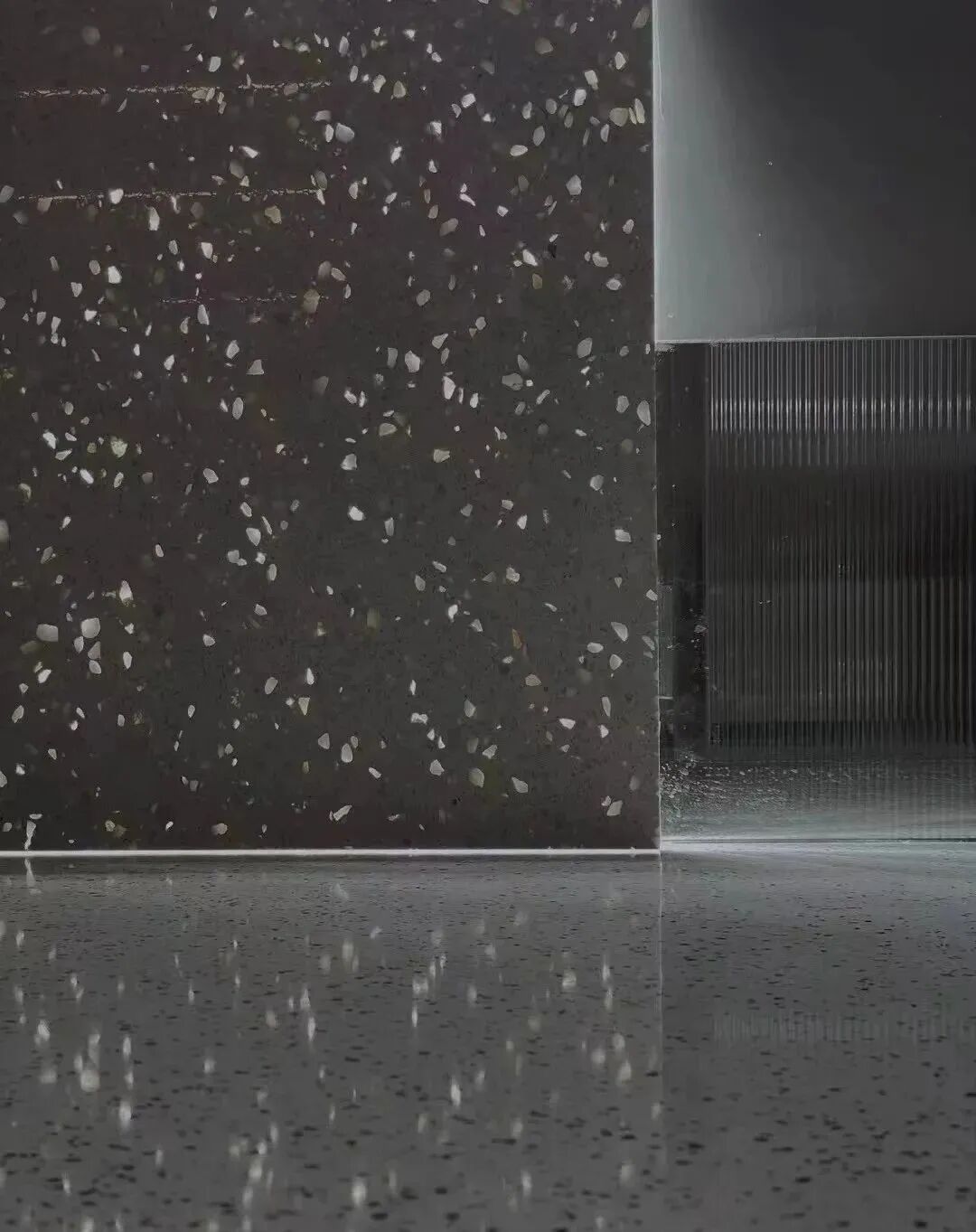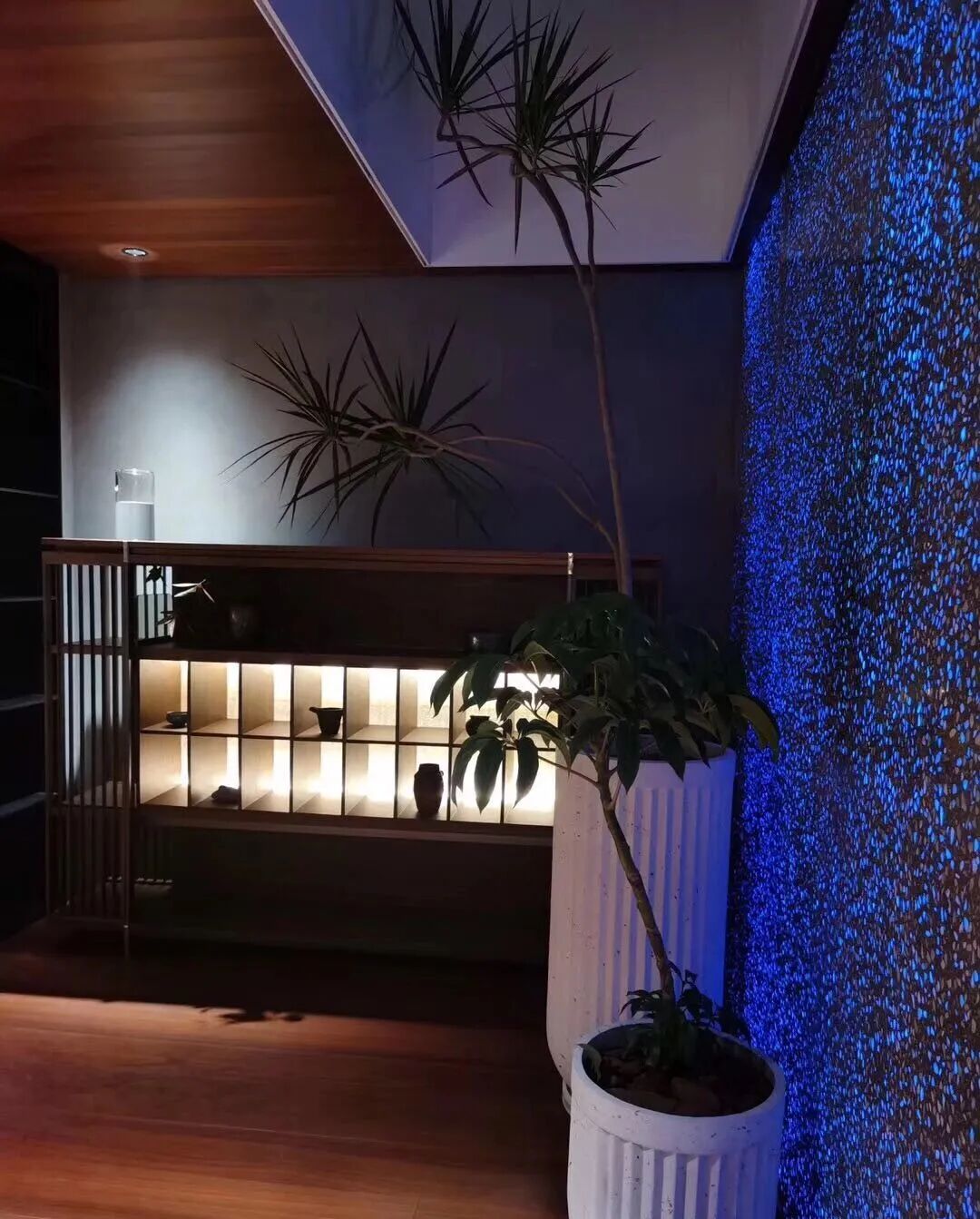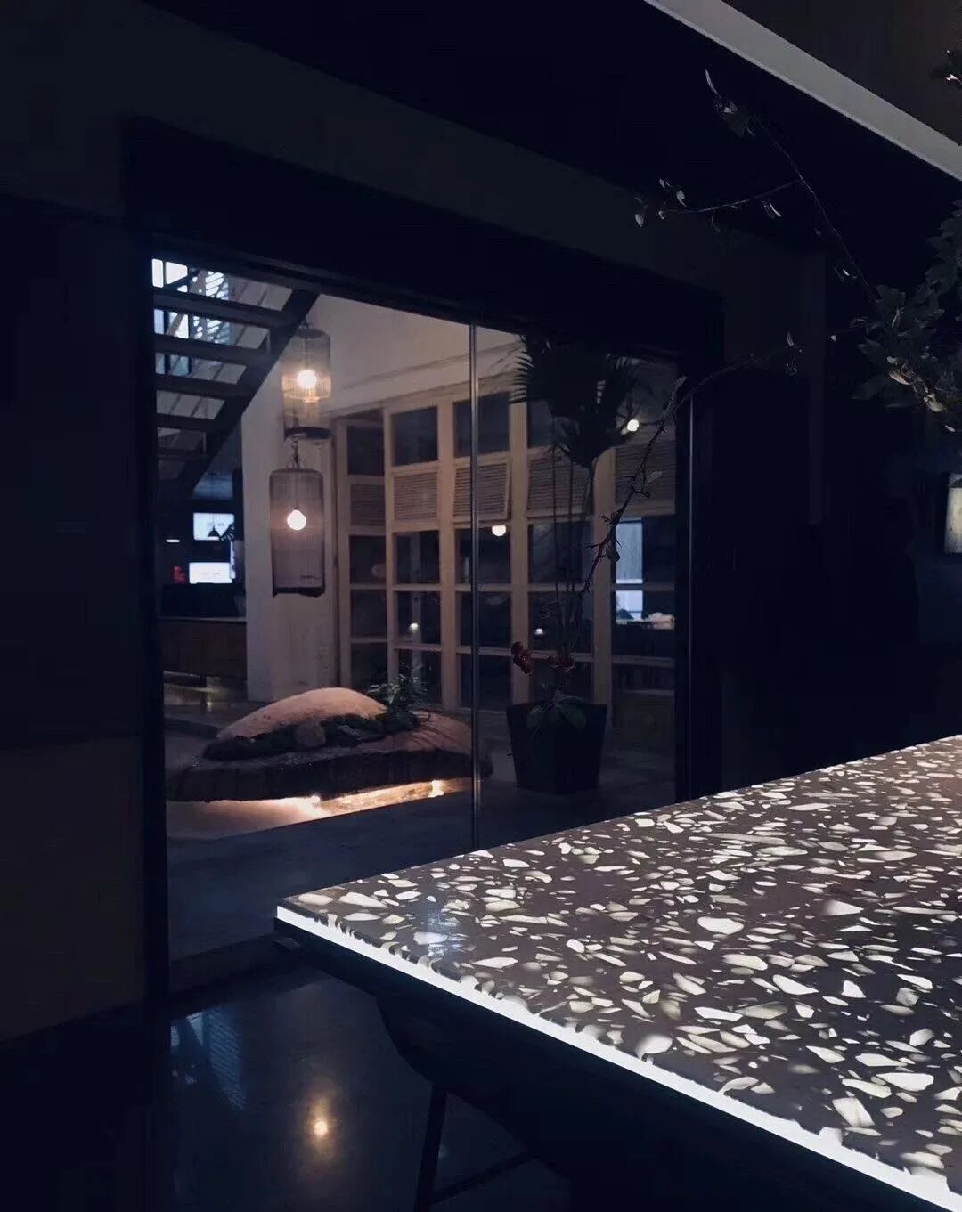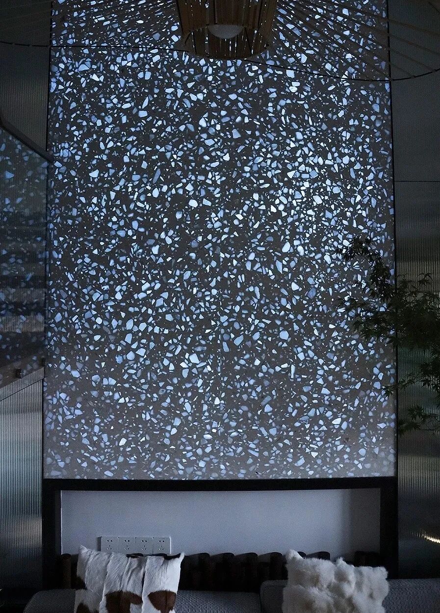 透光水磨石做为一种新型材料,它给空间营造了一种隐喻神秘又有科技未来的氛围,它又像是把宇宙的星河打造成你想要的模样看似一般的水磨石,加入了特别的透光石材后,在具备独特的纹理的同时具有透光性。