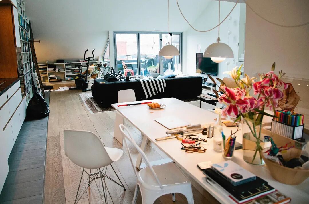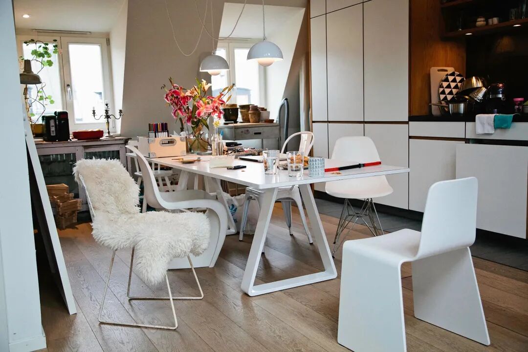 Tomas Skoging在餐厅中,白色的Flowerpot吊灯来自北欧品牌&Tradition。© friendsoffriends