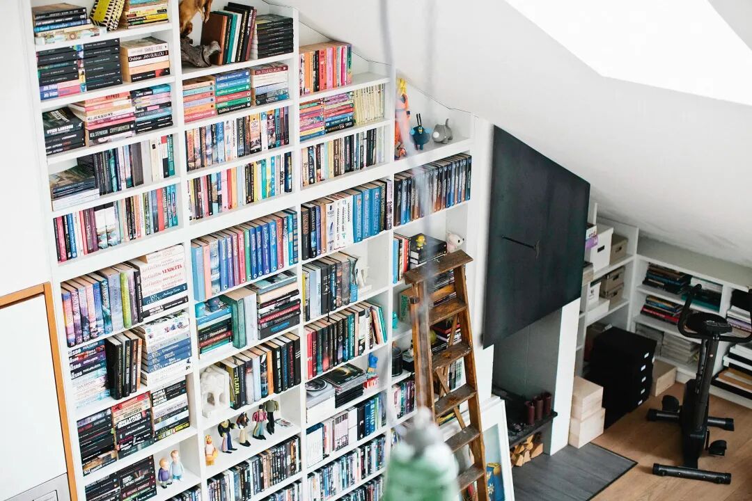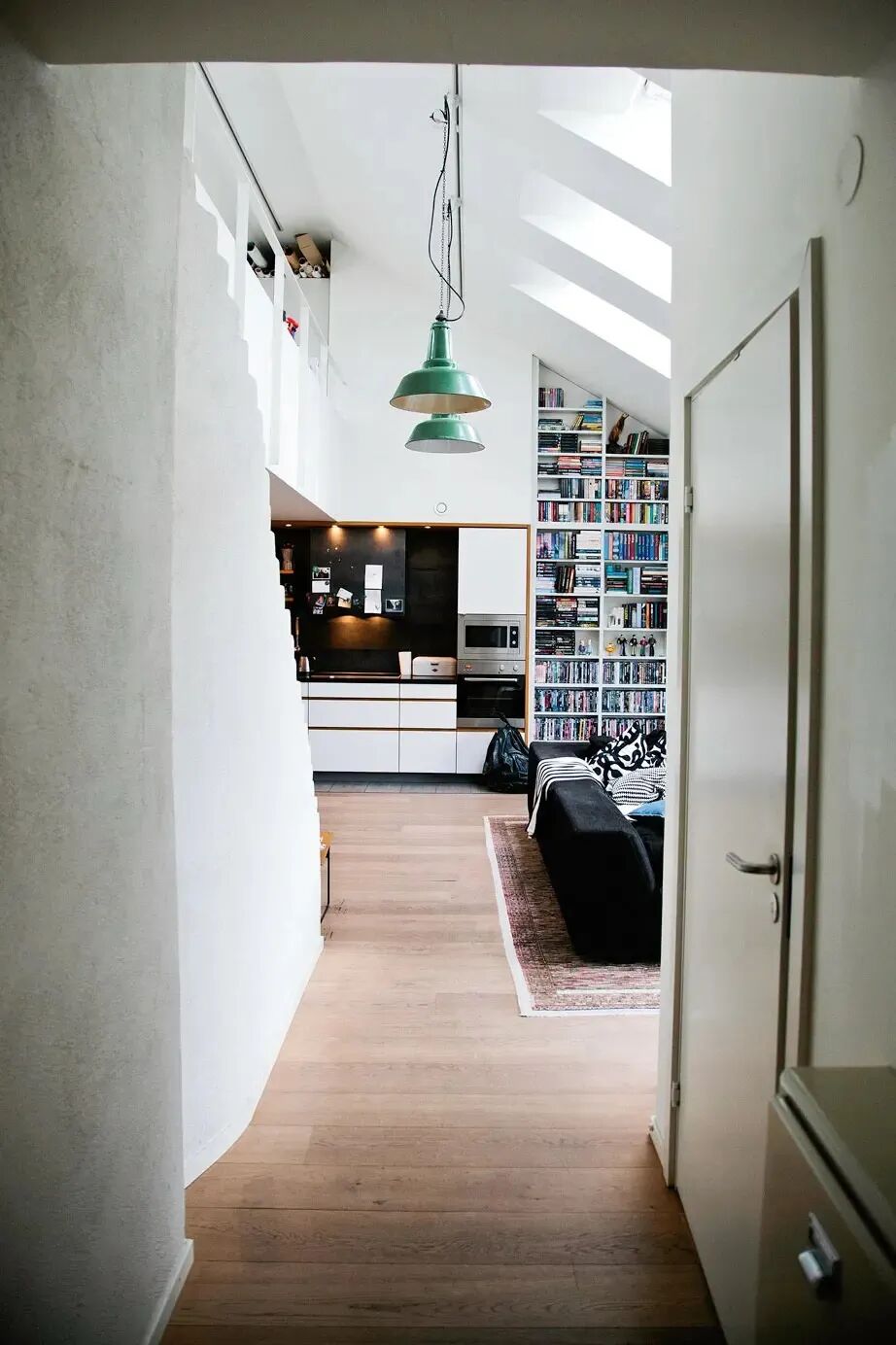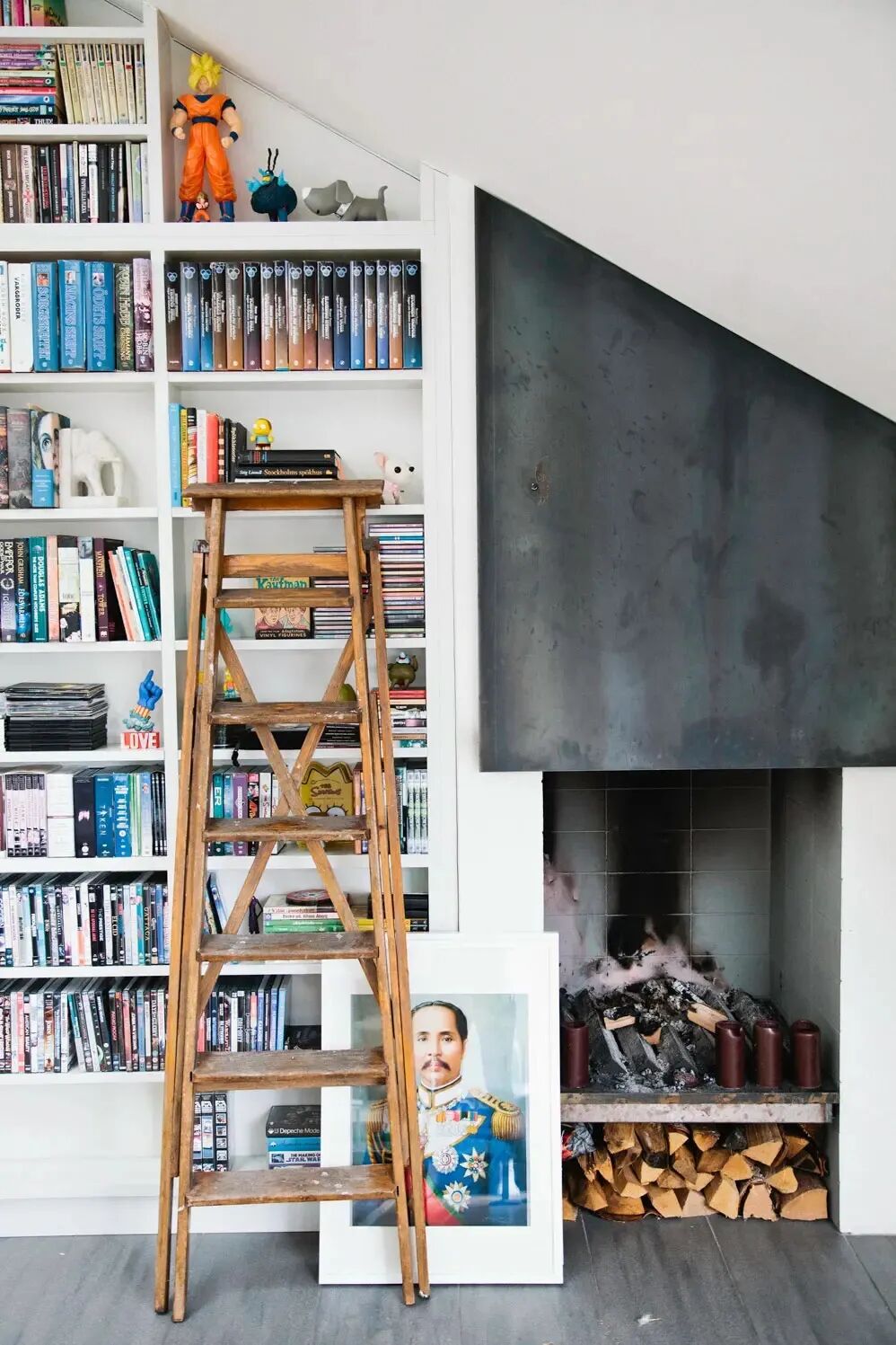 房屋本身并不是规整的房型结构,阁楼的斜切角为家制造出一个极具趣味感的效果,而身为创意人的Skoging也因地制宜,将客厅空间打造成一个看似简单却包含满满细节的空间,例如其中一个斜切角被改造成为一级级的小阶梯,成为了一个个小的展示台;挑高带来了采光与开阔感,却也在某种程度上造成了空间的浪费,Skoging充分利用挑高空间打造大容量书架......在空间精心布局的背后,是屋主对生活的极佳把控。