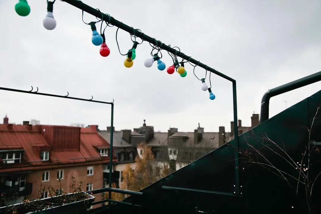露台上彩色的Chaise A Chair以及活泼的小彩灯点亮了北欧的阴天。© friendsoffriends