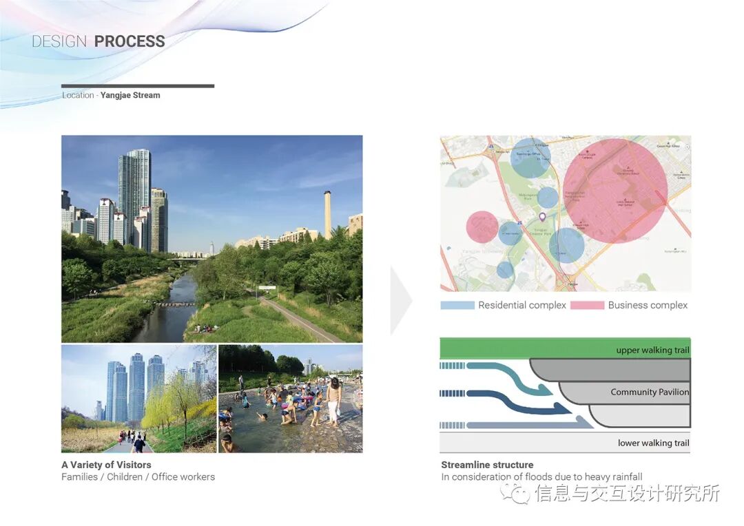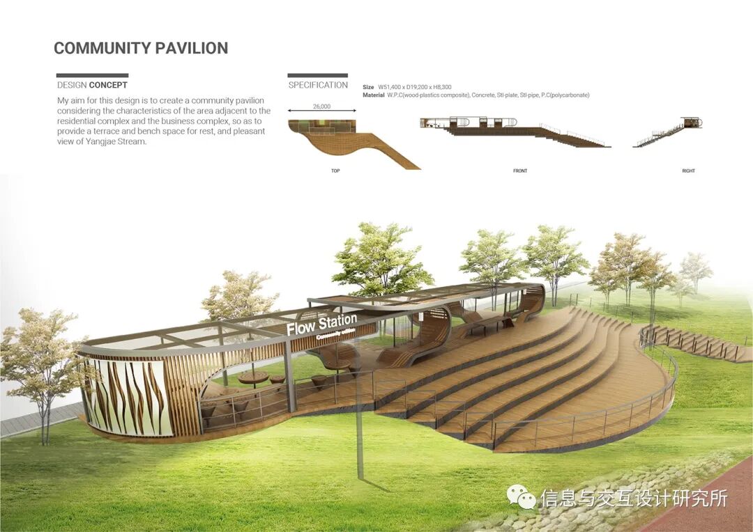 设计者的设计目标是结合住宅区和商业区的特点,创造一个社区亭子,提供一个露台和长椅休息的空间。并欣赏到羊在溪的美景。。