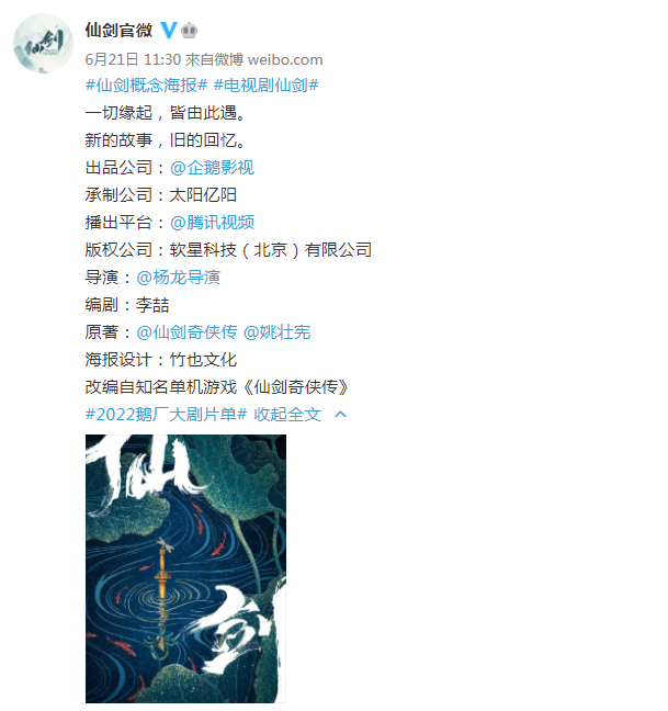 近日,同样是以游戏IP《仙剑奇侠传》围绕故事改编的电视剧,官宣开拍。《仙剑》官宣信息中显示概念海报是由设计师黄海创立的公司“竹也文化”操刀!海报是以李逍遥和赵灵儿初遇的仙灵岛荷花池为背景设计。其中,矗立在池中的木剑,暗指李逍遥。而倒映在水中的画面,与木剑相接的是代表着女娲后人-赵灵儿的天蛇杖。