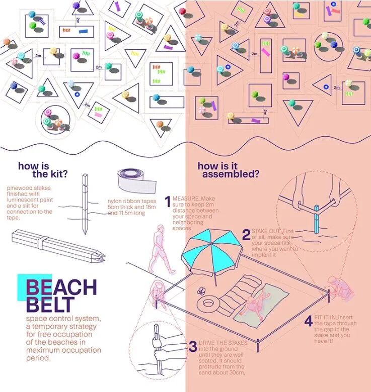 jajaxd collective除了添加了可应对大流行后现实的创意和解决方案,还推出了“沙滩带”套件,该套件可帮助人们在海滩上保持必要的社交距离。