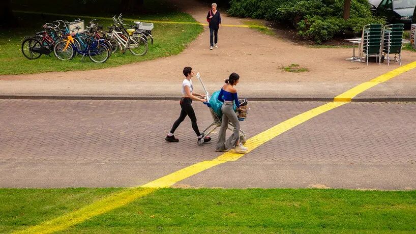 艺术家们创造了一个黄色的正方形,面积为49.03米x 49.03米,产生了2,404平方米的面积。如果将荷兰面积平均分配给荷兰人,这就是每个荷兰人将拥有的空间。在接下来的几个月中,希望在其他国家/地区建立几个“个人广场”,并为每个相关国家/地区计算面积。