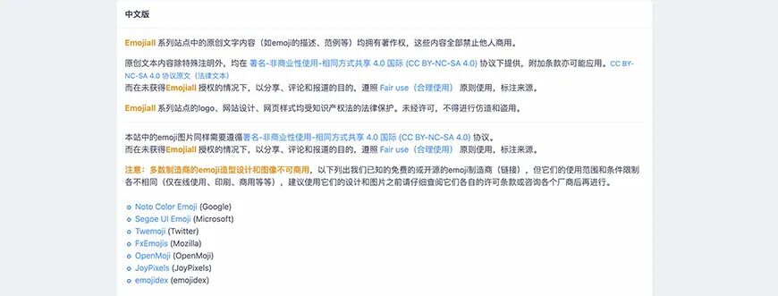 全站并不是全部的 Emoji 都可以进行商用,只有一小部分可以,关于商用权限的部分网站中有明示,大家可以了解一下: