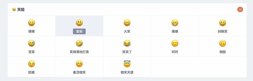 无论我们通过哪种筛选方式找到一个想要得到的 Emoji,我们都可以通过一样的方法获取它们。以「Emoji 分类」详情列表页为例: