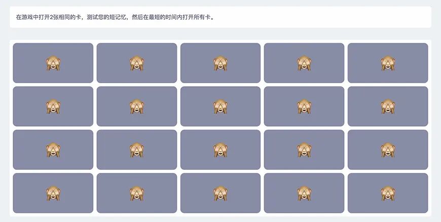 然后「 Emoji 记忆翻牌小游戏」就是普通的记忆力小游戏,通过翻卡来消除同一个样式的 Emoji: