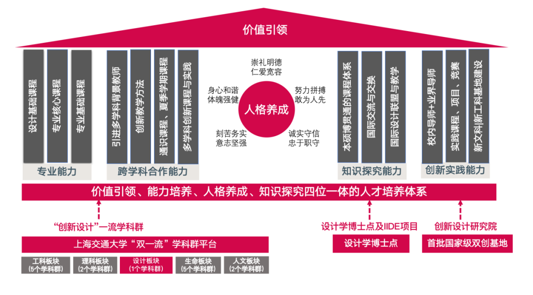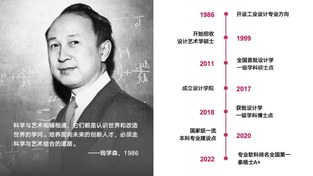 交大设计学院的工业设计专业由世界著名科学家、两弹一星功勋奖章获得者钱学森首倡设立,他提出“科学与艺术相辅相通,它们都是认识世界和改造世界的学问。培养面向未来的创新人才,必须走科学与艺术结合的道路。”为交大设计定下了基调。34年的时间里,交大设计不断成长、自我突破、探索前沿发展至今,获评国家级一流本科专业建设点(2020年),专业软科排名全国第一(2022年),泰晤士A+(2022年),纵向项目经费、SCI期刊论文、国家社科重大项目、专著和专利等均居于全国排名首列。