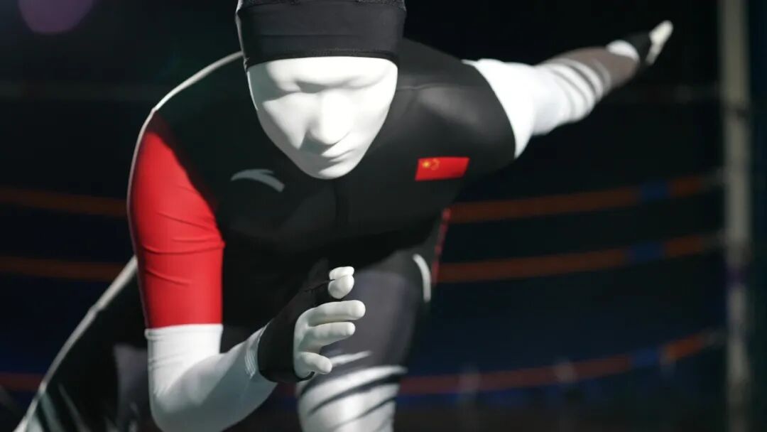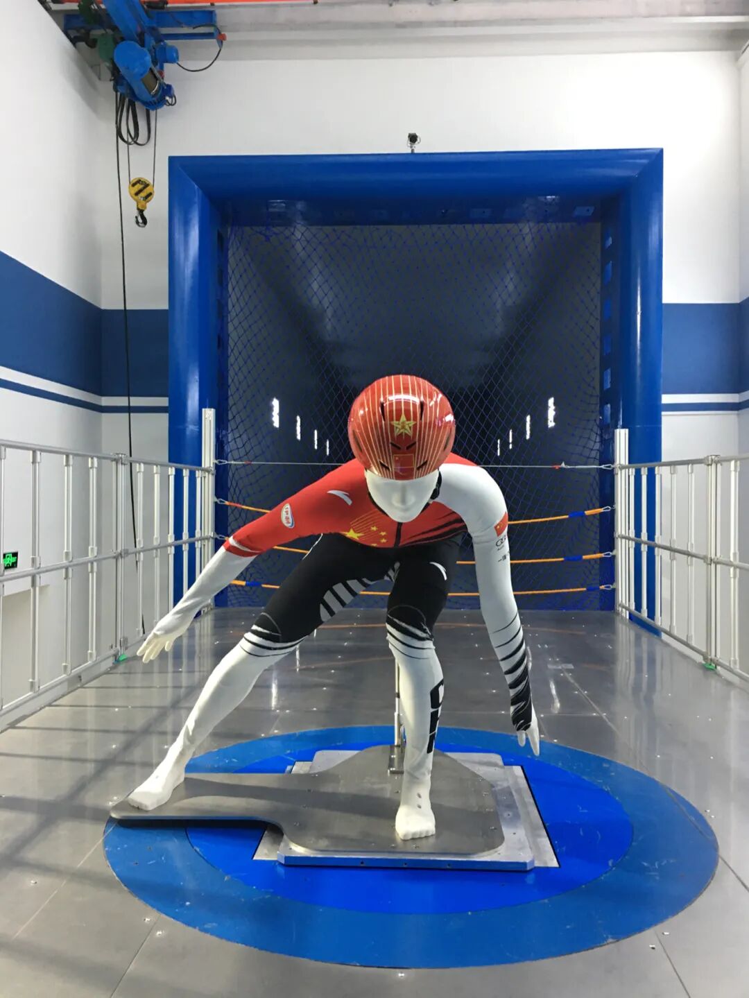 中国短道速滑队运动员任子威动态测试柔性人台在二七厂冰雪项目训练基地进行风洞测试