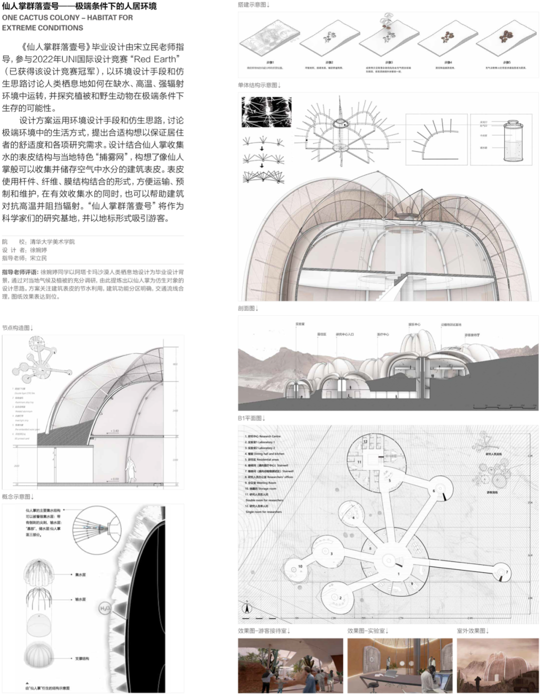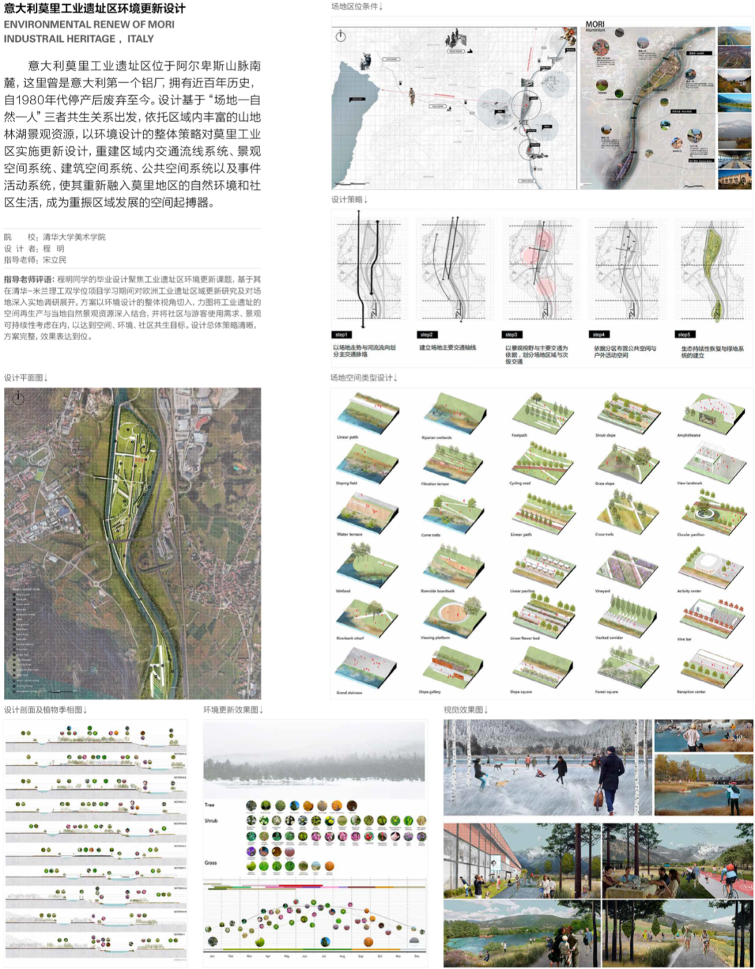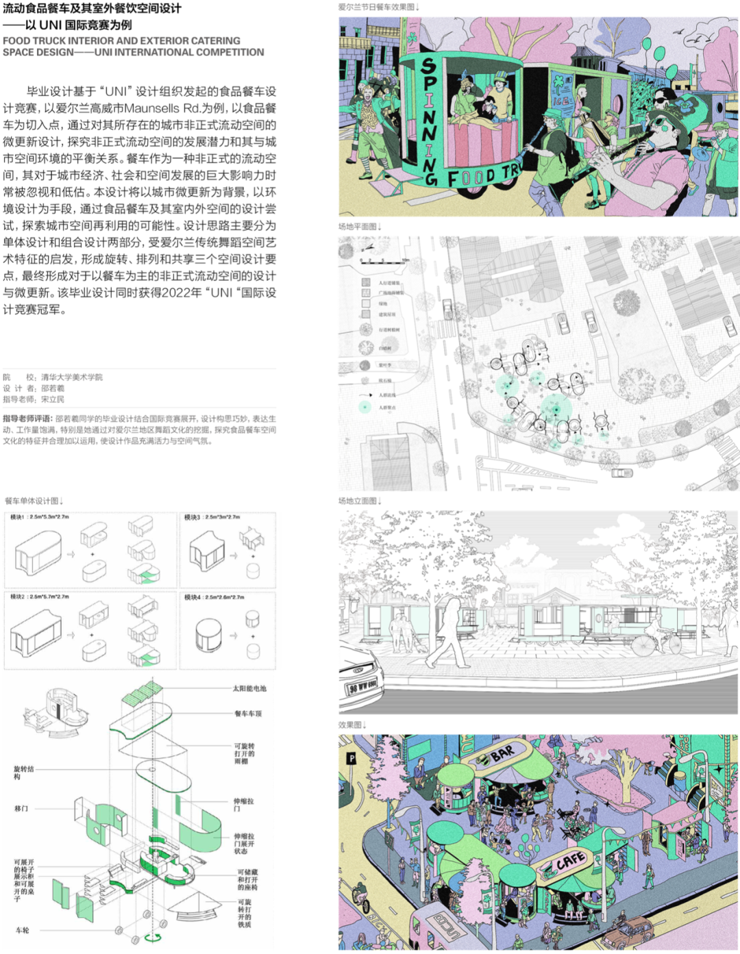 近几年,我系一部分指导教师所带毕业设计选题依然是传承工艺美院带毕业设计方式,选题以实际项目为背景,有政府的街区改造、国家重点工程的场地形象设计等,也有商业项目,房地产楼盘景观设计等项目,这中间有些课题是以甲方任务书作为设计目标,还有一些只是以实际场地为背景,另拟任务书设计。以实际项目为选题的毕业设计,一般较重视形式语言、设计表达、风格创意等方面的呈现。还有一部分导师开始尝试在毕业设计选题中加入跨学科与创新设计元素。可以归纳为“环境设计+”。如环境设计+社会学;环境设计+心理学;环境设计+生态学;环境设计+数字技术等。部分教师直接以国际竞赛为题,选择专业对口、内容、题目与截止时间适合毕业班学生参加的国际竞赛项目作为毕业设计选题。我本人从2019年到2022年就以国际竞赛为题带了四届毕业设计,参与的12位同学中有一位获得2019年UNI国际竞赛第一名,二位同学分别获得2022年两个国际竞赛第一名。国际竞赛的题目相对单纯,看重创意创新,要求具有国际视野与清晰表现力,与学生在毕业设计中要达到的目标高度吻合。创新性课题一般要求师生对所做设计的宏观与微观观察、联想、思考与感悟有更深入的探究,重视观念、设计思维、解决问题的方法与程序是其特征,而是否具有独树一帜的解决方案是决定该类型毕业设计成功的关键要素。
