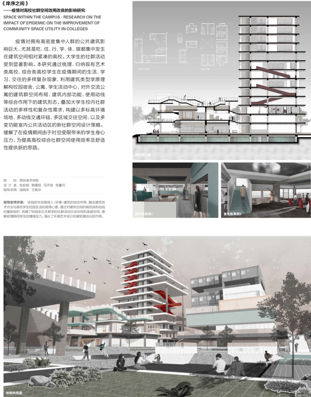 众所周知的疫情原因,这两届毕业生无法外出进行针对性的田野调研和考察,许多关键性辅导环节只能选择在线上进行,因而在题材选项上受到了很大影响,作业深度也受到极大限制。可能正是这一原因,这届学生在选题上的关注点比往年集中了许多,并主要呈现出两大倾向:一个是有关元宇宙话题的概念性设计,也许由于全世界陷入延续三年的新冠疫情,恐惧、压抑和不自由的居家隔离生活成为人们内心逃离现实世界的一种强烈欲望,一个超越现实的虚拟世界可能迎合了大家的心理需要,所以今年对于这一题材感兴趣的学生较多;二是受疫情影响,人们更加关注自己的生存空间和生态环境的质量,以绿色概念为主导的康养和疗愈性建筑环境设计更是学生们关注的热点话题之一。