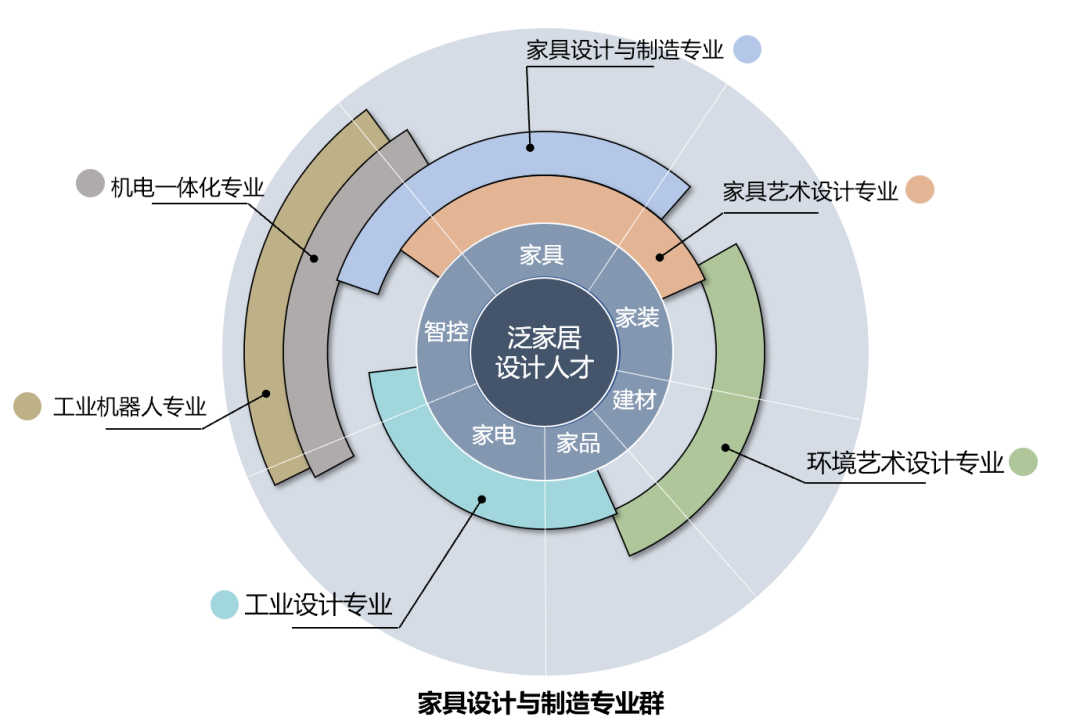 顺德职业技术学院设计学院建设家具设计与制造国家高水平专业群,将聚焦服务于佛山市泛家居万亿产业集群以及顺德“两家一花”传统优势产业,形成与区域优势特色产业同生共长的机制。家居产业包括了家具、家电、家装、建材、饰品、智控等类别的产品及产品间的资源整合服务,由于我国快速发展的房地产经济,无论是家具、家电、家品设计以及环艺、智控产品设计均需要大量的家居产业设计人才,专业涵盖从过去的单一设计发展到今天的家具设计、家电设计、家装设计、家品设计、智控设计等全方位、多范围的设计领域,对所需设计人才综合素养的要求越来越高。因此,家具设计与制造国家高水平专业群通过整合家具设计与制造专业、家具艺术设计专业、工业设计专业、环境艺术设计专业以及工业机器人、机电一体化等多个专业,才能更有效地匹配家具、家电、家装、智能控制等家居领域的综合设计专业人才的需求。