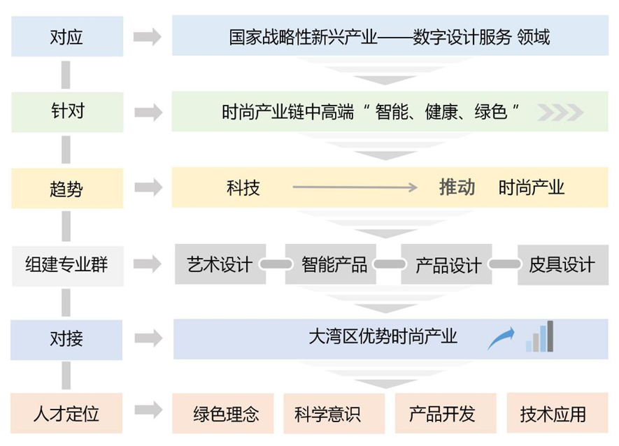 我们广州番禺职业技术学院艺术设计学院紧跟国家的发展,支撑国家战略,融入区域发展、服务产业升级对高素质技术技能人才的需求,精准对接国家战略性新兴产业“数字设计服务”领域,针对时尚产业链中高端“智能、健康、绿色”趋势,围绕培养“通艺术、晓科技、精设计、会制作、善人文、懂市场、具有国际视野”的复合型设计技术技能人才的目标,对接粤港澳大湾区智能穿戴产品、健康时尚服饰、数字媒体交互、智能化空间设计、数字化形象设计等中高端时尚产业。