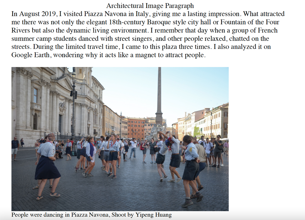 上图是我关于Piazza Navona写的建筑评论的节选。思路就是由旅行的观察引发自己对于建成环境的思考。