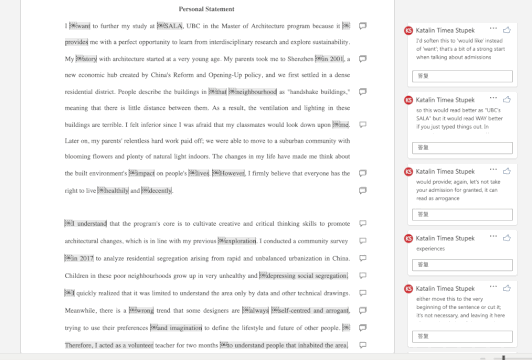 这里真的要感谢文书Katalin老师,每次一篇文书能够我写好几页的修改建议,老师按照海外文书的要求和思维逻辑给我修改润色,真的获益匪浅。