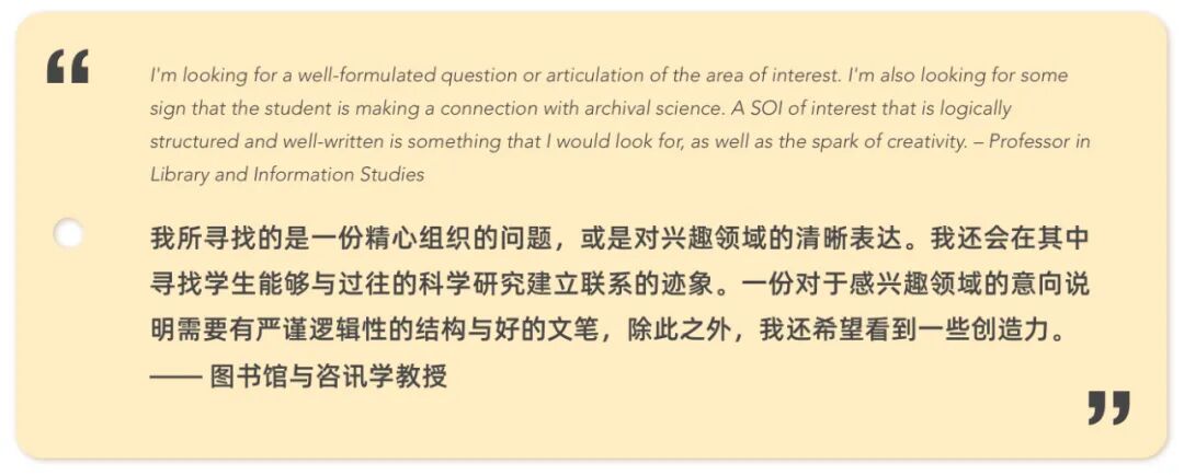 避免使用大而广的句式回答自己的择校原因,如:学校对科研及其重视/ 学校拥有几百门学科书籍的图书馆。申请者需要提供的是真正被吸引的理由和具体细节(某个课程内容/授课老师的研究方向/实践机会),这样的信息才会得到招生老师的认同。同时也反应出申请同学对学院,设施,课程和教授进行了透彻的研究和充分的准备。