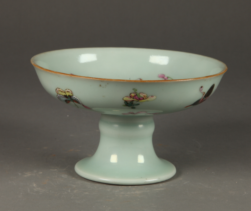 清 乾隆款豆青釉粉彩花蝶纹高足盘
