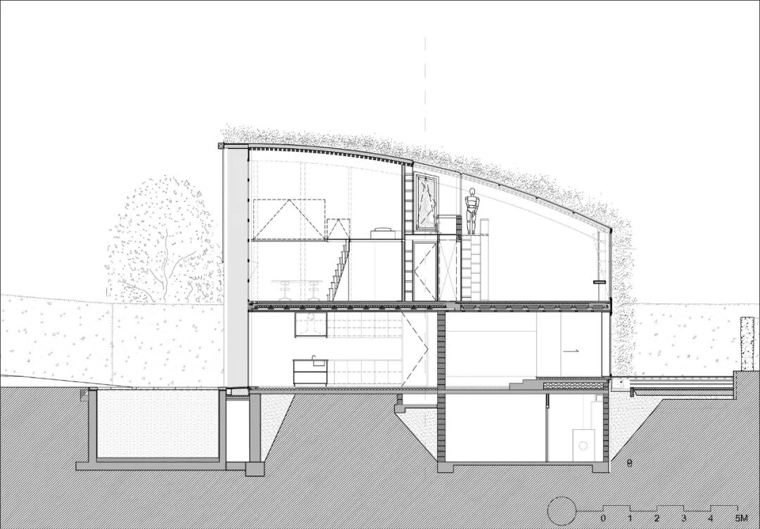 该住宅呈弧形,且外立面被植被覆盖,所以非常隐蔽,对北部、东部和南部都是封闭的。相比之下,西立面完全是玻璃幕墙,仿佛是一个被分割出来的巨大的窗口。