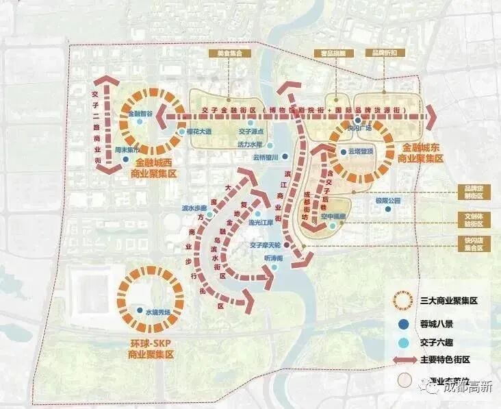 2020年12月31日,全新升级的交子公园金融商务区,将按照“一核、一轴、一带”的整体规划,以TOD、COD、EOD理念,打造成都中心TOD、交子文化商业轴和国际滨水休闲带。