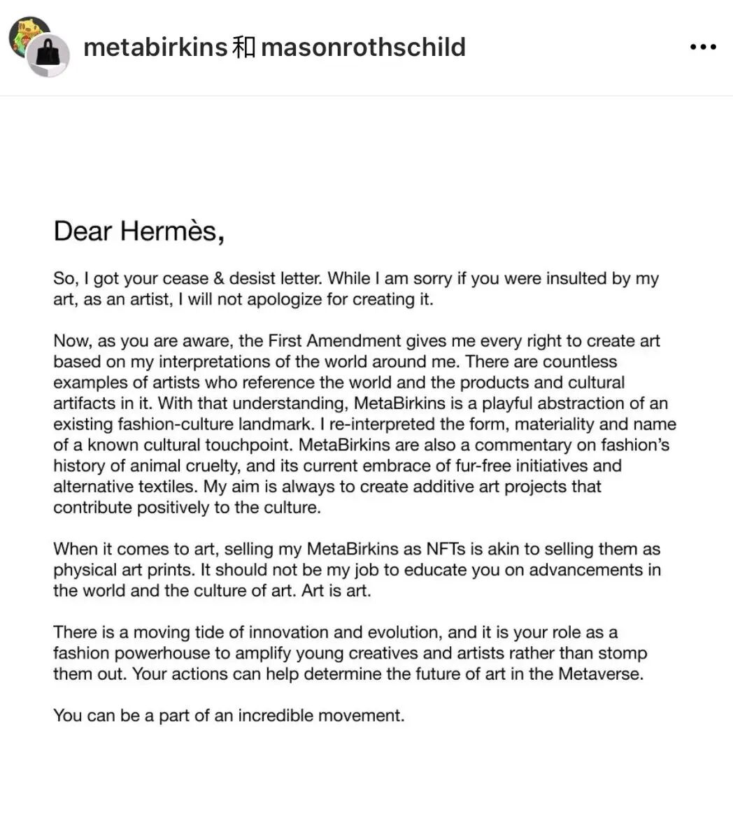 Mason Rothschild 曾就“MetaBirkins”系列侵权争议而公开致信爱马仕。