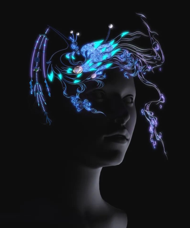 数字时尚实验室 Xtended Identity 是最早利用 Web3 的产品创新潜力为珠宝打造虚拟渲染材料的实验室之一。观众可以通过 Xtended 的专用交易平台选择拥有或租用一件该品牌的另类作品,其中包括受蝴蝶启发而设计的翩翩面纱以及层叠燃烧的火焰头饰。这些设计的怪诞美学使它们几乎无法在日常生活中被穿戴,但在元宇宙中,一切皆有可能。