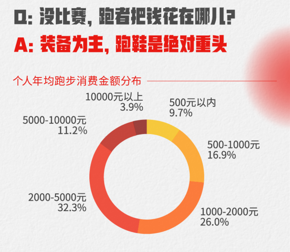 James一年在跑步装备上的花费在2000-5000元区间,“跑鞋损耗很大,比如我每月平均跑量150k,半年肯定要换鞋子。”