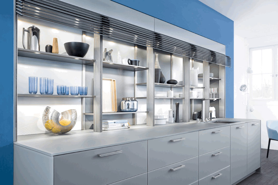 2015年,即原有的框架系统LE CORBUSIER系统之上又开发了Xtend+,呈现更加智能的未来窗墙面收纳系统。只需要轻轻的触碰,整套厨房便会打开所有的收纳区,优雅而富有科技美感,金属与玻璃的材质在被Xtend+完美演绎。