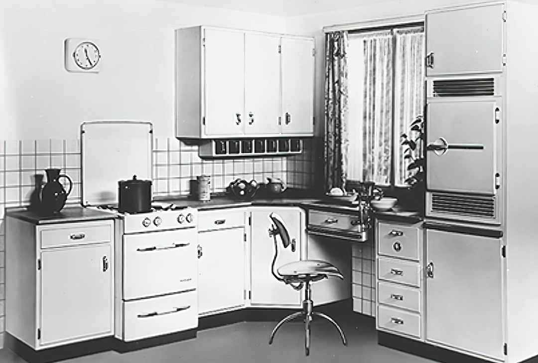 同时有趣的是图片中使用多彩厨房的女人被称作为最幸福的女人;1954年,LEICHT推出的木制贴皮橱柜开始流行于世界。1954年以后,劳斯的批量化生产技术与供应链日益完善,而同时迭代的基础五金和嵌入式电器让橱柜与现代厨房正式开始接壤。