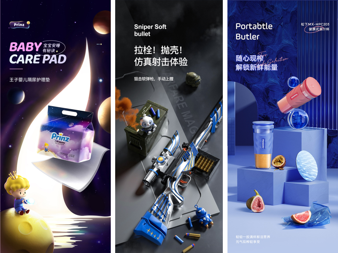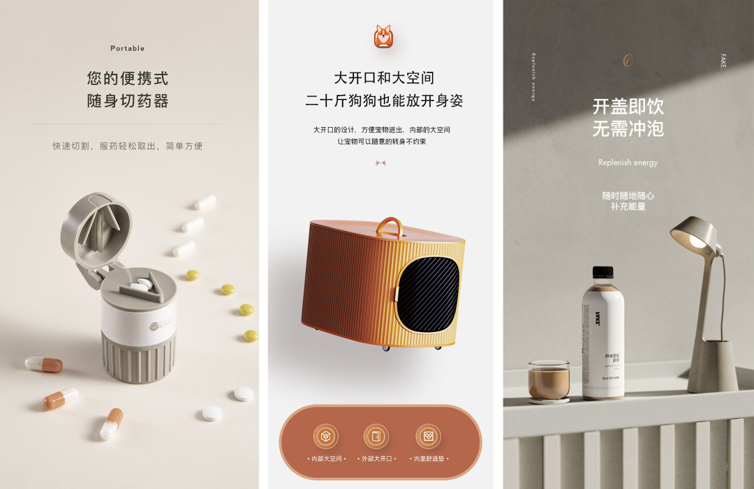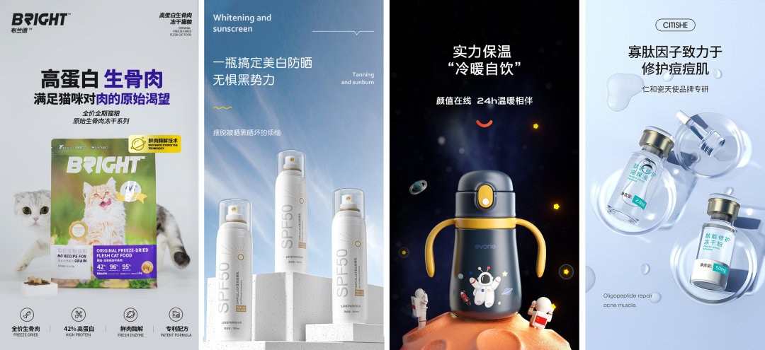 如上图所示,不管产品如何摆放,只要画面重心始终相对平稳,居中对齐的排版就很好用,也是最不容易犯错的,看几组案例: