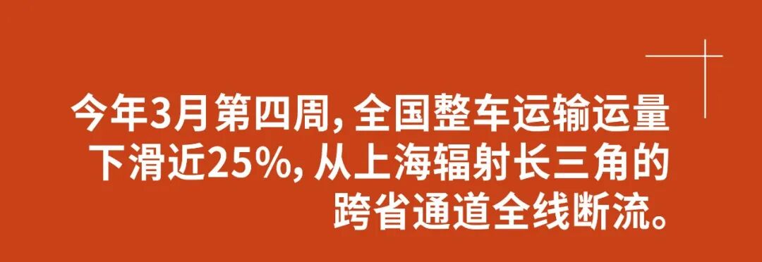 常年来,我国公路运输承担着四分之三的货运任务,而物流联合协会的数据显示,在今年3月份的第四周,全国整车运输运量下滑近25%,特别是从上海辐射长三角的跨省通道全线断流,这个情形就像是壮年男子突然间的心肌梗塞。