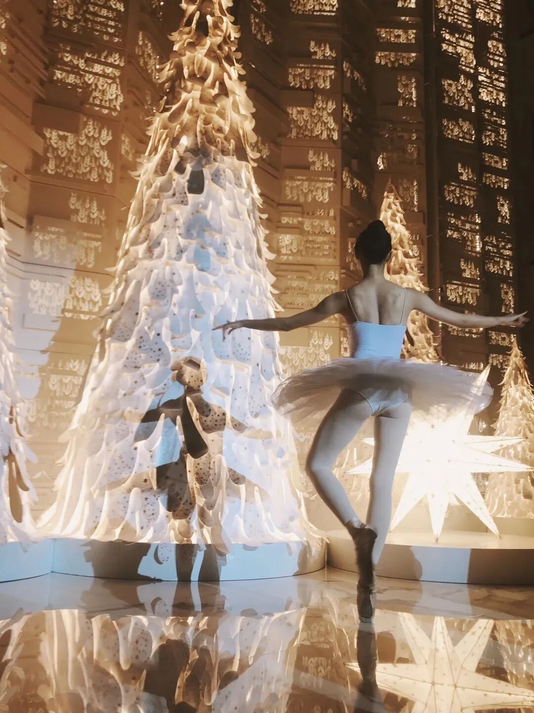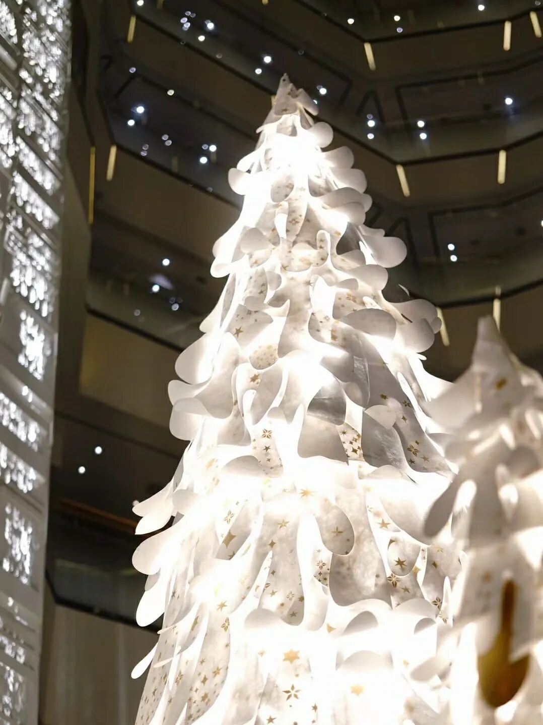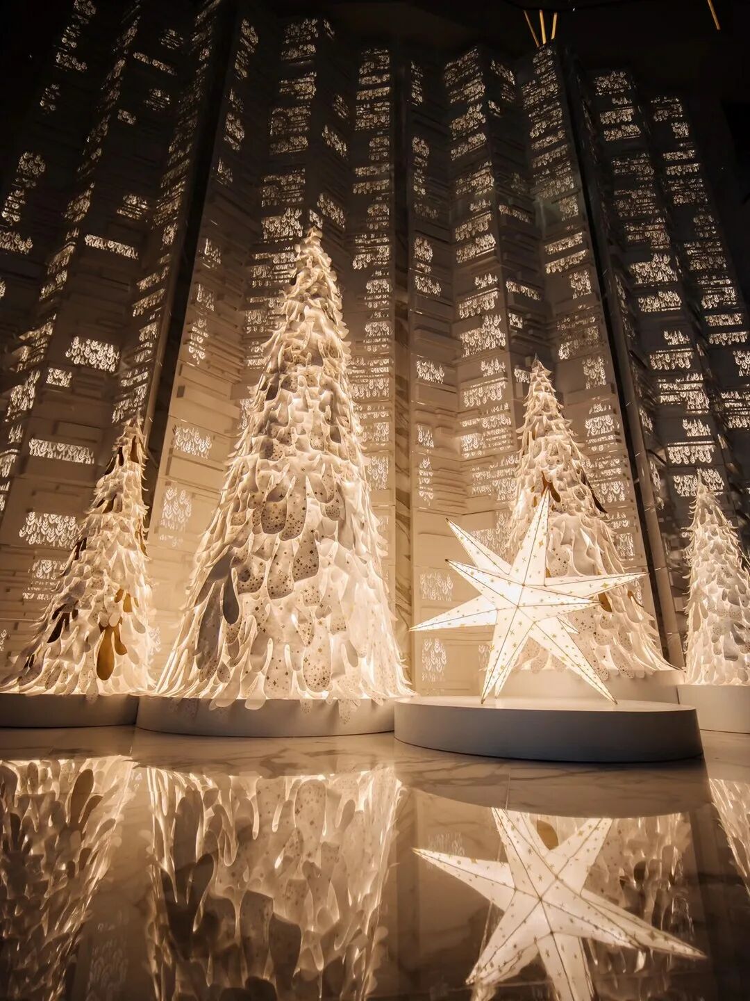 斗转星移,在掀开星河的这一天便拉开了冬季的序幕。从大熊星座徘徊的森林里面,艺术家温秋雯(Small D)用杜邦™ Tyvek®材料将精心选中的树一一移植。这无数的星光,沾上金银色的树叶枝与缝隙,光线透过金色图案洒向天空,树木伫立在漫天飞雪之后,叶子的形状和树渐渐融合在一起变成了一个整体,汇聚着无数闪着光的美好愿望。