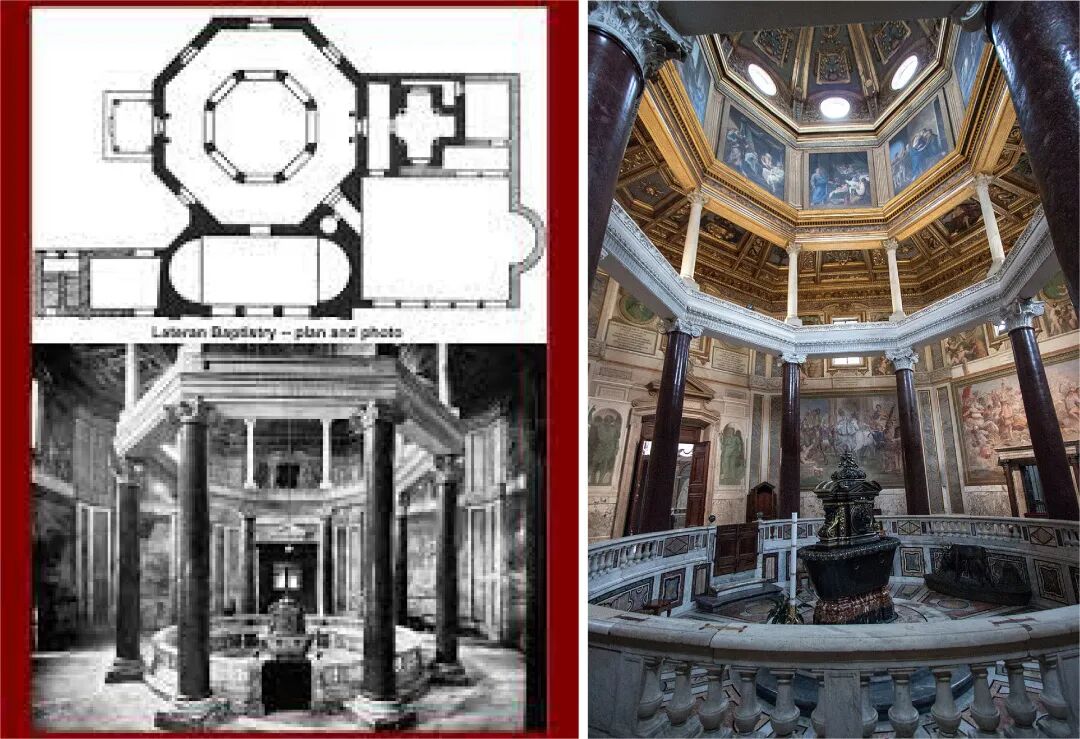 集中式布局的教堂空间还被用于洗礼仪式。洗礼需要用到水,所以这种空间灵感来源于罗马浴场中的空间,且常被设计为八角形的,象征着世界在上帝创世后的第八天开始运行。
