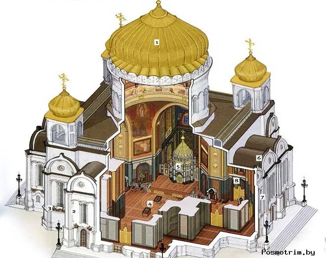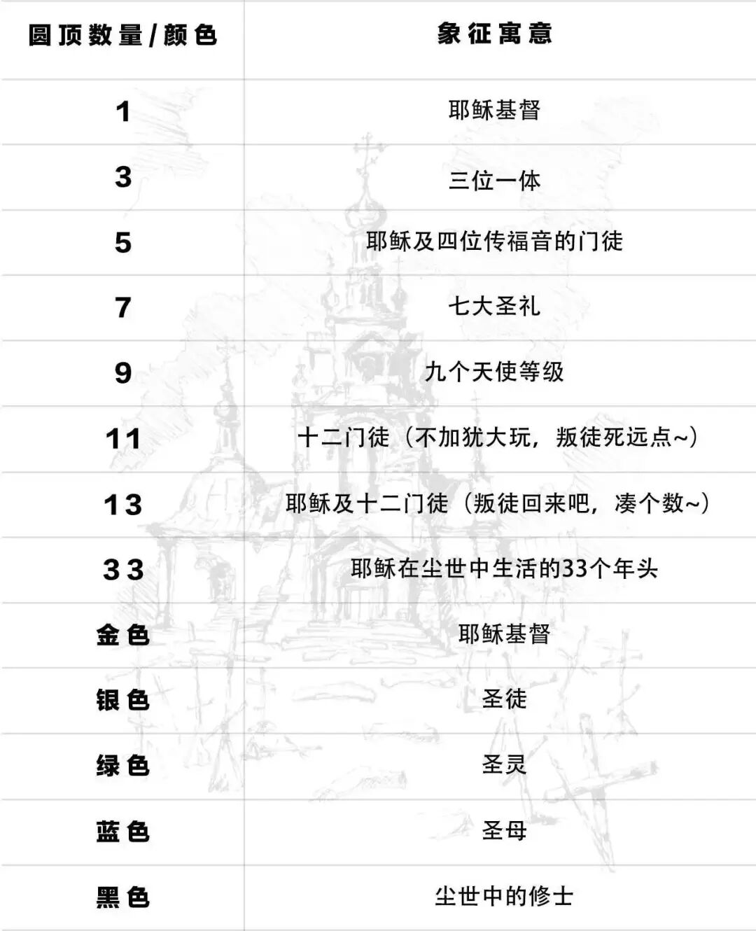 比起高度超凡的天主教堂,东正教堂不屑于盲目地追求身高,东正教堂们更在意体态的方正沉稳以及内涵的丰富寓意,比如多数东正教堂的主入口设在西端,象征着礼拜者从罪恶的黑暗(西边)进入到真善美的光明中(东边)。圆顶的数量(多为奇数)和颜色也大有讲究,基本都取自圣经里的典故:
