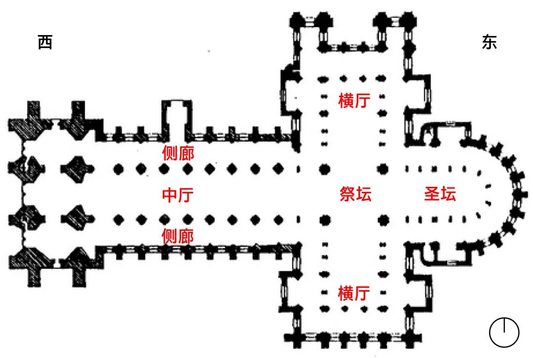 为了满足天主教日趋复杂的仪式要求,需要在祭坛前增建一道横向的空间,其目的是为了给主持仪式的神职人员使用,休息或准备仪式所用的器具,待仪式开始后,他们可以在两边的横厅进入,而坐在观众席的信众就可以看到流畅的仪式了。