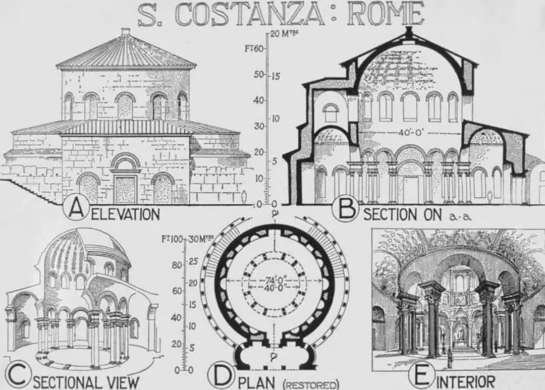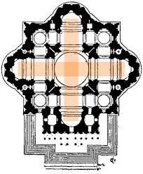 自巴西里卡后,又一建筑形式也进入了基督教的视野,这就是之前历史的伏笔,一切的起源: 平面集中式布局。由于基督教创立之初并不被承认,教徒经常受到迫害,于是基督教出现了大量的殉道者(Martyr),所以为了纪念他们,忠烈祠(Martyrium)也就应运而生。而殉道与死亡是联系在一起的,所以原本用于陵寝的集中式布局就被借鉴了过来,成为了教堂建筑形式的一部分。