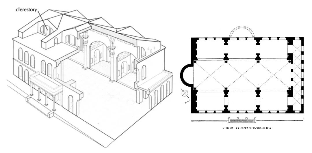 巴西利卡式可以理解成带有侧廊的长方形大厅,古罗马时期常被用作法院、集市等集会场所,且具有一定的世俗权威。长方形的空间适合举行仪式时的游行,而带有的侧廊正好便于将女性和新入会的成员和正式成员区分开来