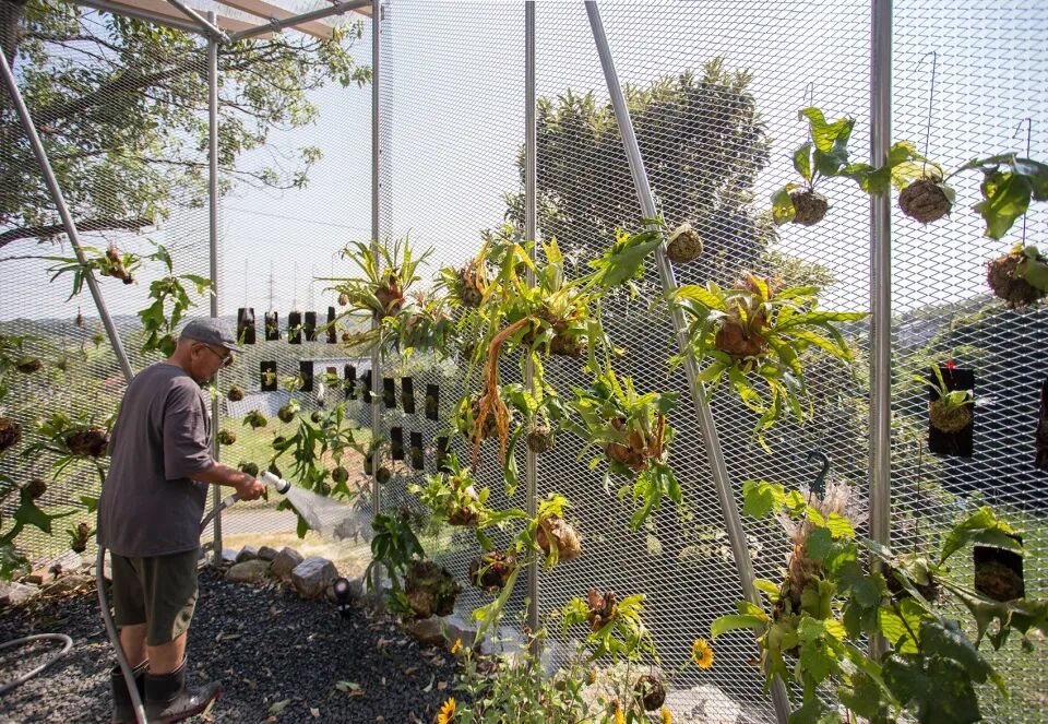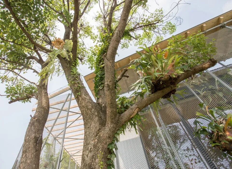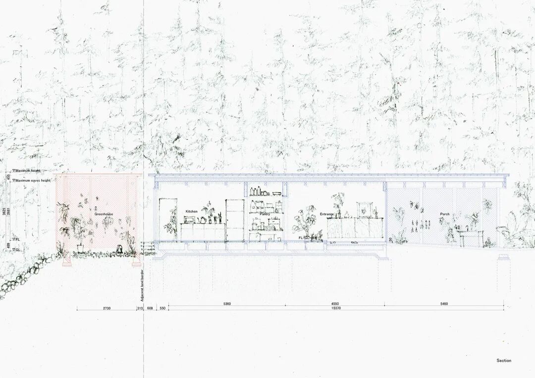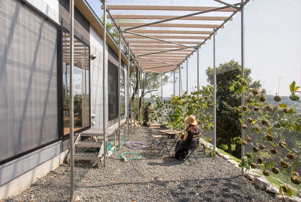 在建筑西侧和南侧设置2个开放的空间,采用钢管为支撑结构,以金属网进行围合,西侧体块屋顶用透明的阳光板形成温室,南侧屋顶以木材为结构成为遮阴避暑之处,2个空间与主体建筑相隔的缝隙清晰的体现空间的功能关系。