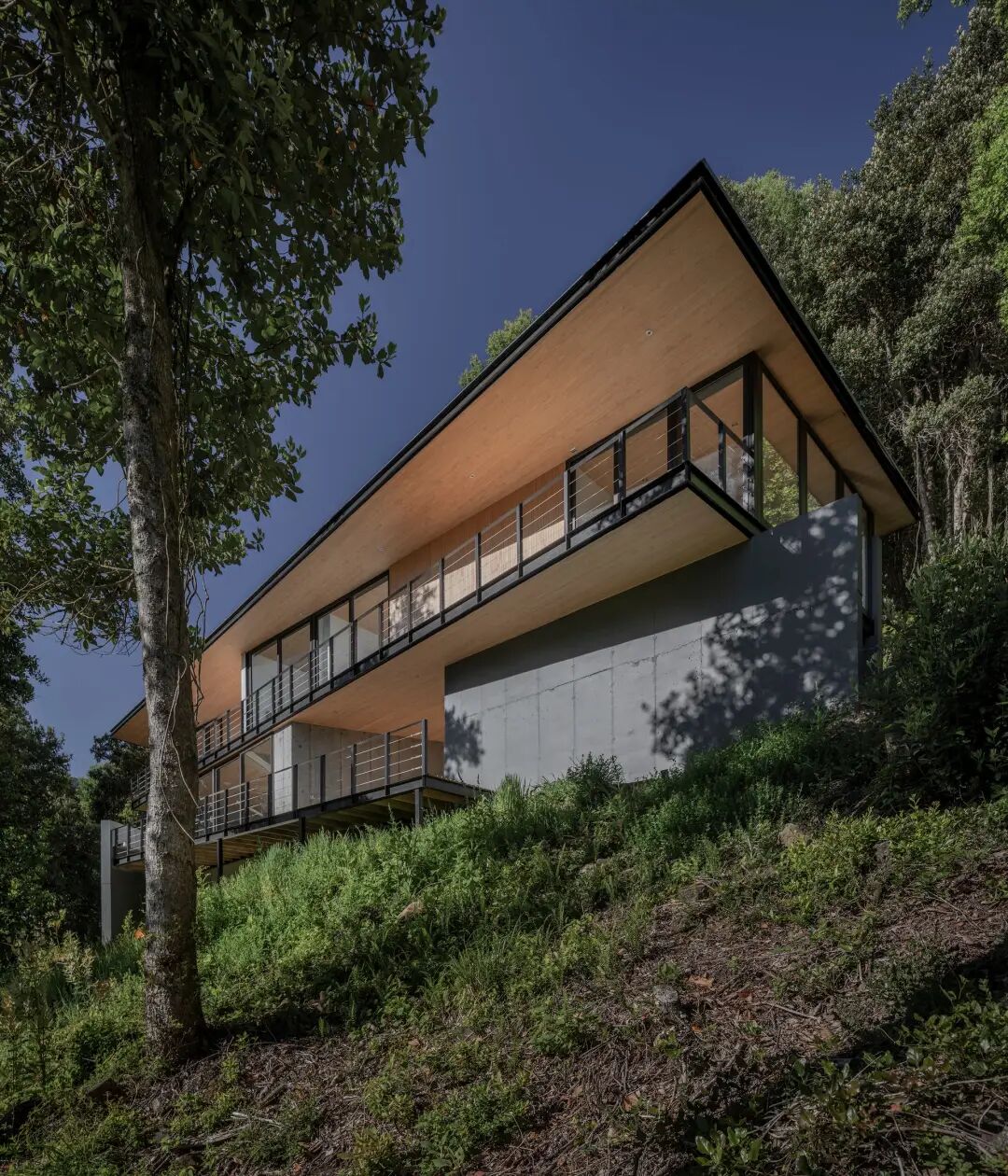 这座采用严格的几何形式建造的混凝土房屋与其地块的原生建筑不同它是由两部分组成的线性住宅,建筑俯瞰阿根廷的calamuchita山谷,主要分成两部分,山顶使用悬臂技术挂在山坡上,主要用于公共空间,较低的空间则是卧室和游泳池。