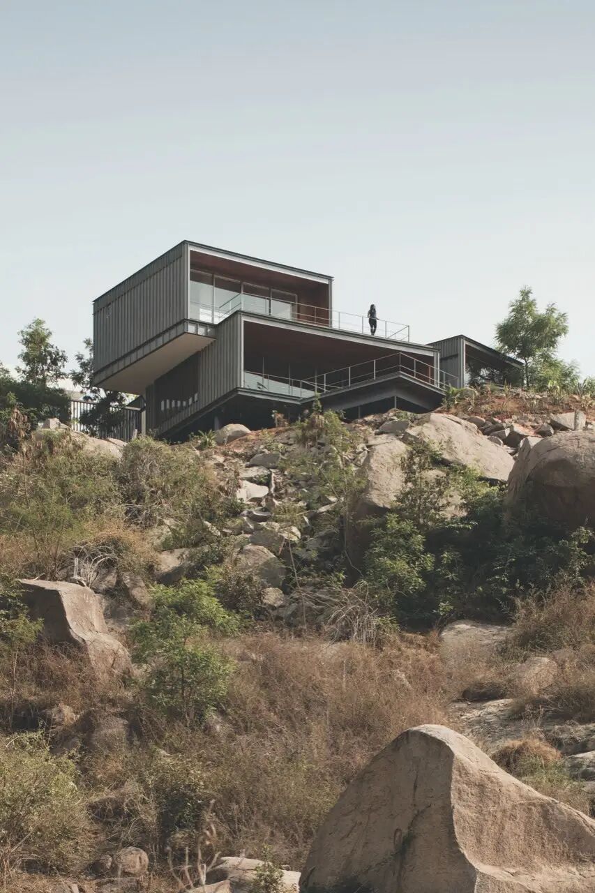 建筑师用堆积的量定义了印度海得拉巴的杜尔加姆·切沃湖上方的这个房子,主体使用钢结构,同时带有当地花岗岩和并列落地窗,创造了一个既沉稳又轻盈的空间。住宅采用干净、现代的设计,通过悬臂式体量和玻璃墙最大限度地展示了壮观的景色,为建筑师保留了场地的完整性,将房子依偎在倾斜的岩石地形中。
