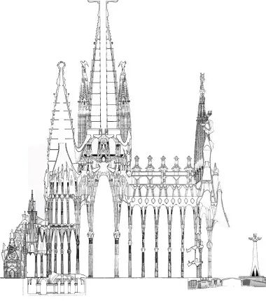 每个立面由代表耶稣基督使徒的4座塔楼(共12座塔楼)组成,靠近教堂中间的这些塔楼是6座较高的塔楼,其中4座是献给福音传教士的。这4个高度相同,设计相似,围绕着中心一座代表耶稣的高塔,这座塔将使结构的总高度达到560英尺,并将使其成为欧洲最高的教堂。