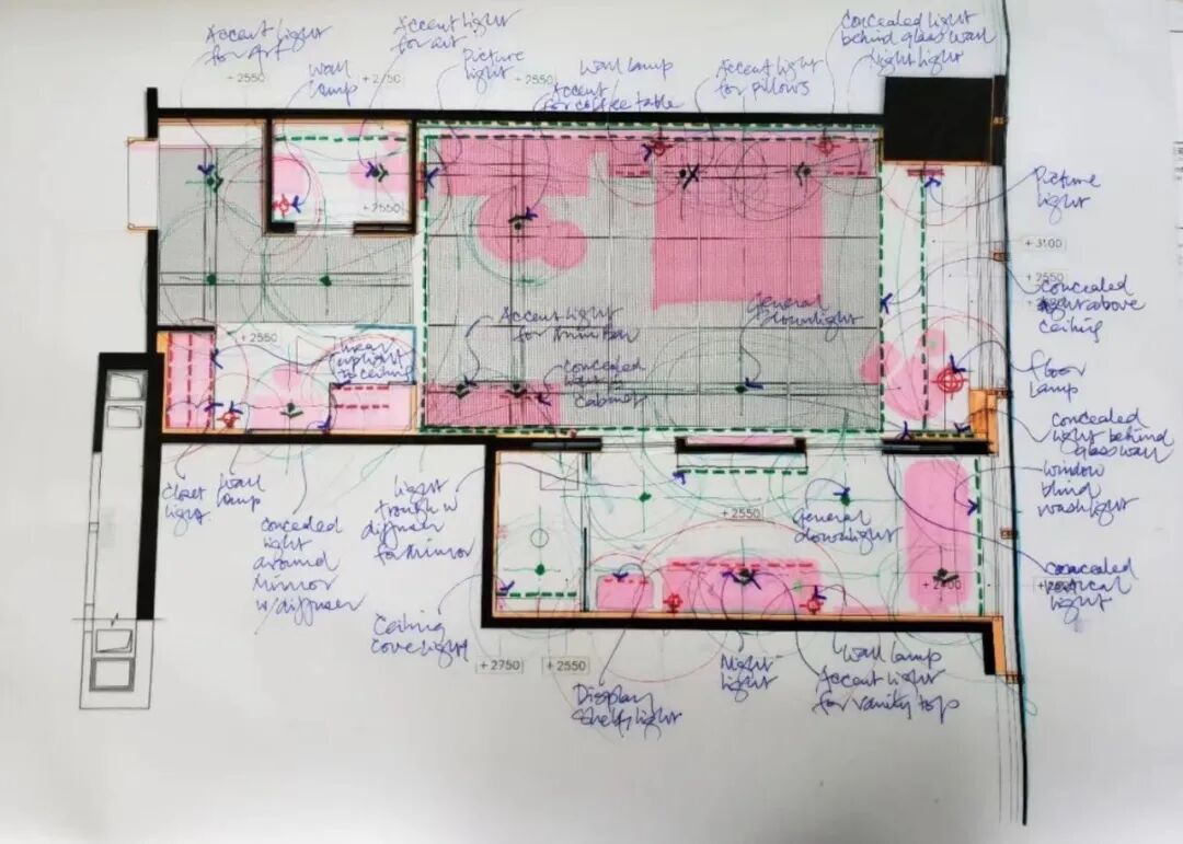 ▲ 关永权的成都瑯珀客房灯光设计手稿。